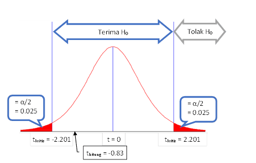 - Karena |thitung| < |tkritis|= |-0.83| < |±2.201|, maka H0 diterima!