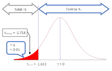 - Karena |thitung| < |tkritis|= |-1.718| < |-1.833|, maka H0 diterima!